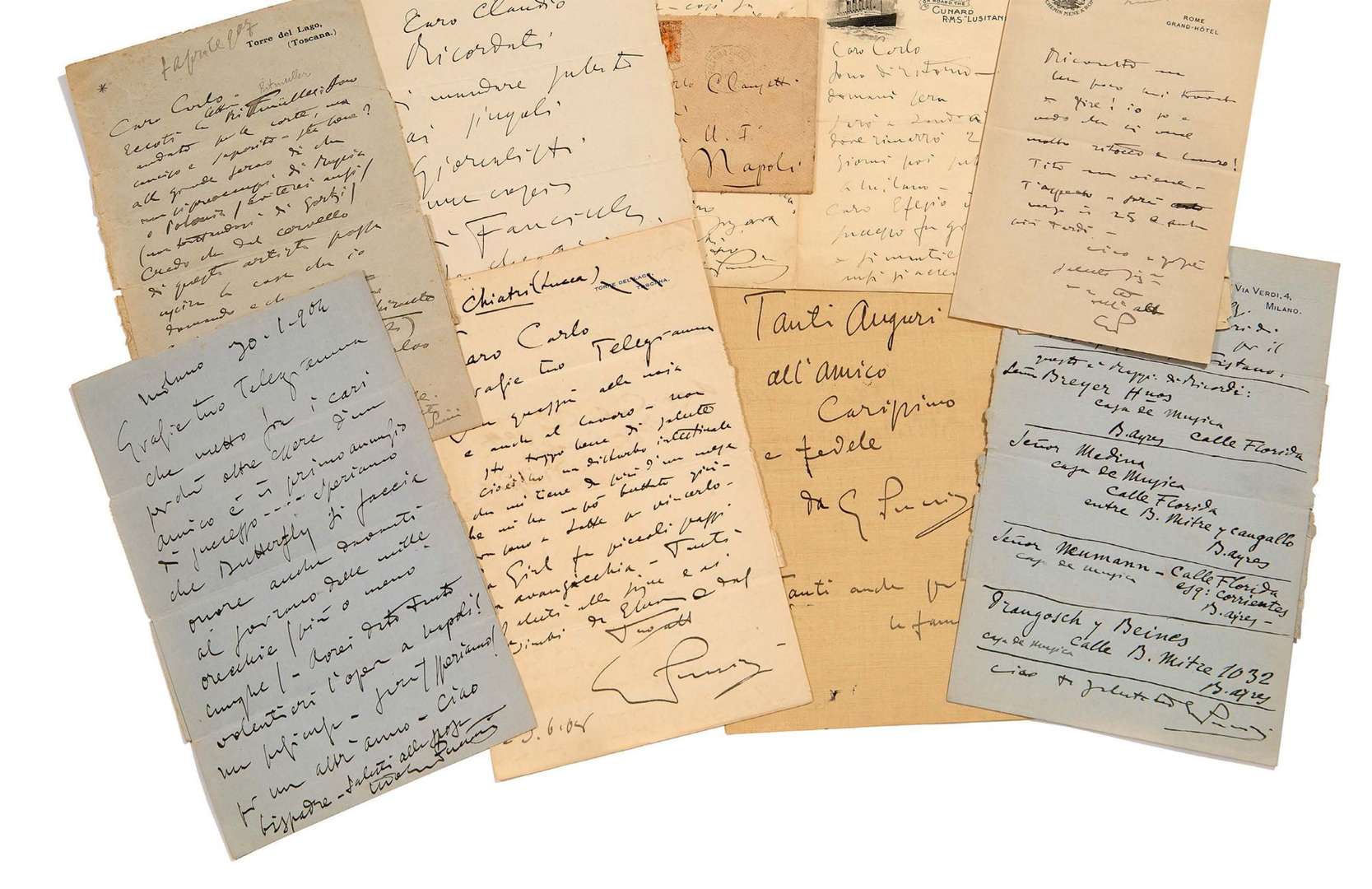 25 L.A.S. «GPuccini» (2 «GP» et 2 non signées), 1894-1911, à son ami Carlo CLAUSETTI | 52 pages formats divers, toutes (sauf une) avec adresse ou enveloppe (petits défauts à une lettre) | sous emboîtage de maroquin vert | en italien.