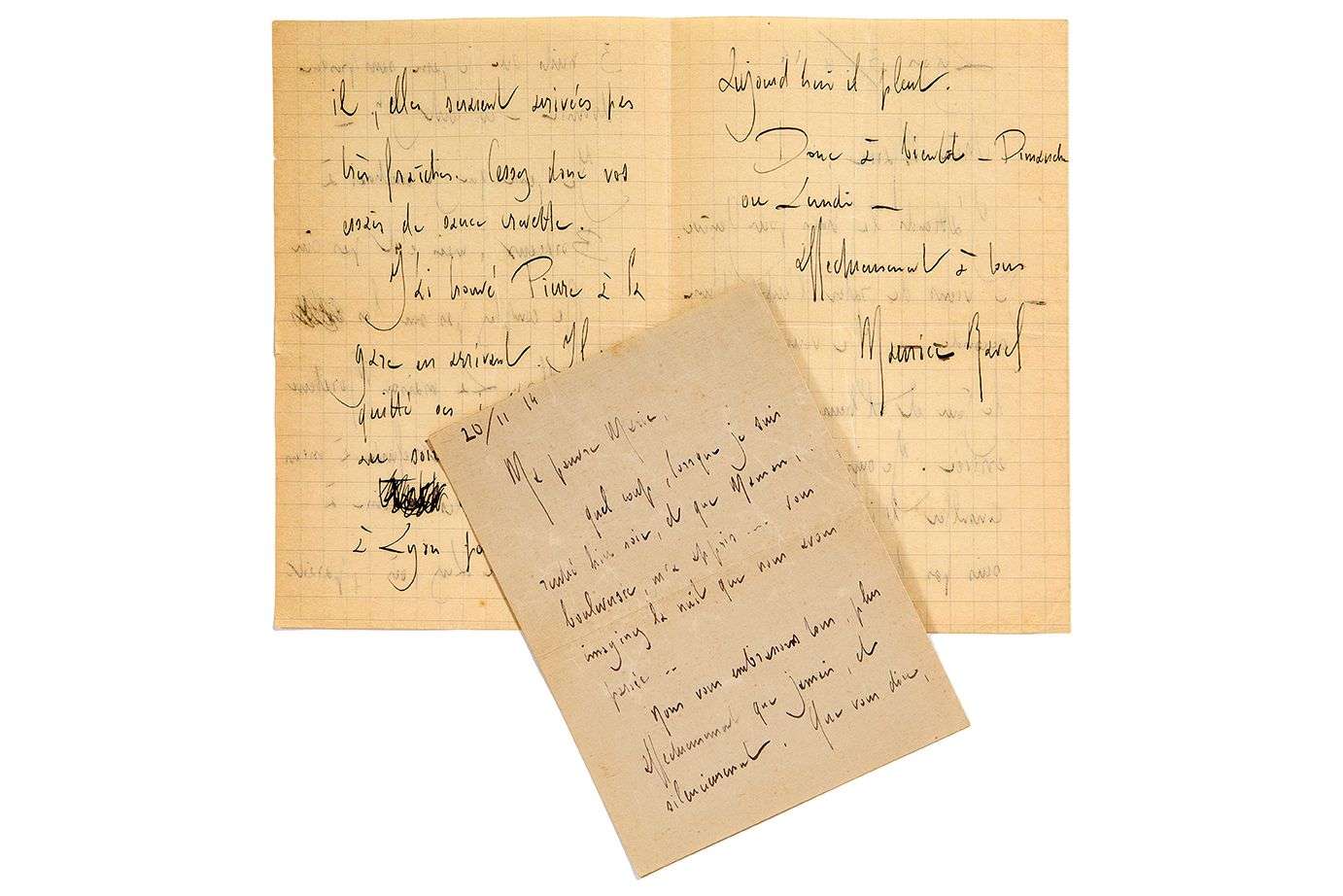 2 L.A.S. «Maurice Ravel», avril-novembre 1914, à Marie GAUDIN | 2 pages et demie in-12 et 3 pages et demie in-8.