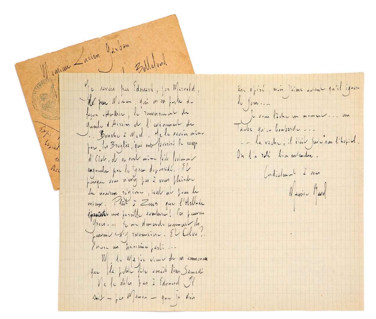 L.A.S. «Maurice Ravel», [Châlons-sur-Marne] 24 septembre 1916, à son ami Lucien GARBAN | 3 pages et demie in-8, enveloppe.