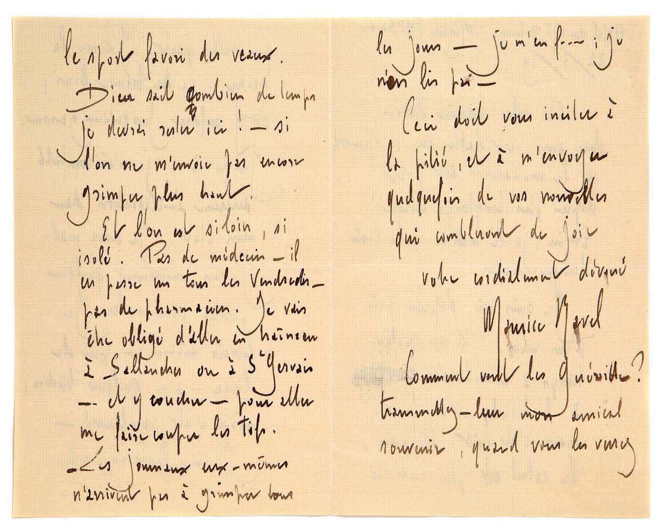 «Je suis ici depuis près d'un mois. J'ai mis quelque temps à m'acclimater à l'altitude et au froid, mais c'est fait. Et puis, le soleil est plus radieux que nulle part. J'aime la neige : ça se trouve bien | on y enfonce jusqu'aux genoux. Jusqu'ici, je n'ai constaté aucune amélioration dans mon état.