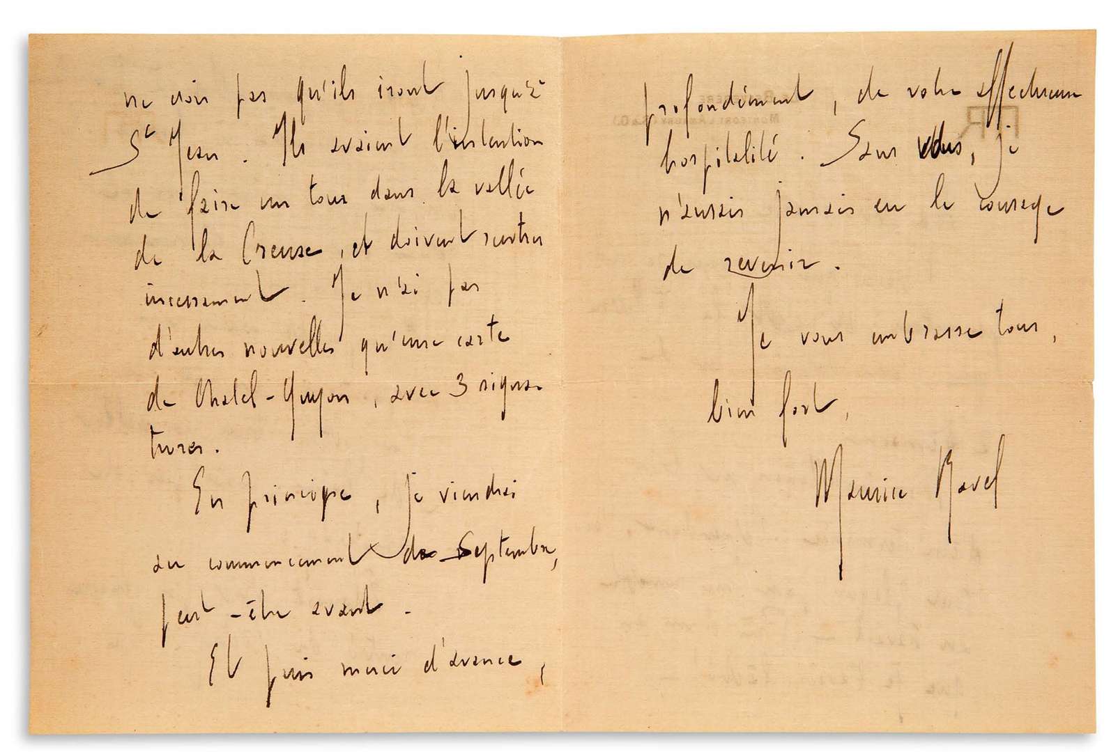 L.A.S. «Maurice Ravel», Le Belvédère, Montfort l'Amaury 10 août 1921, à Marie GAUDIN | 4 pages in-8 à son monogramme, enveloppe.