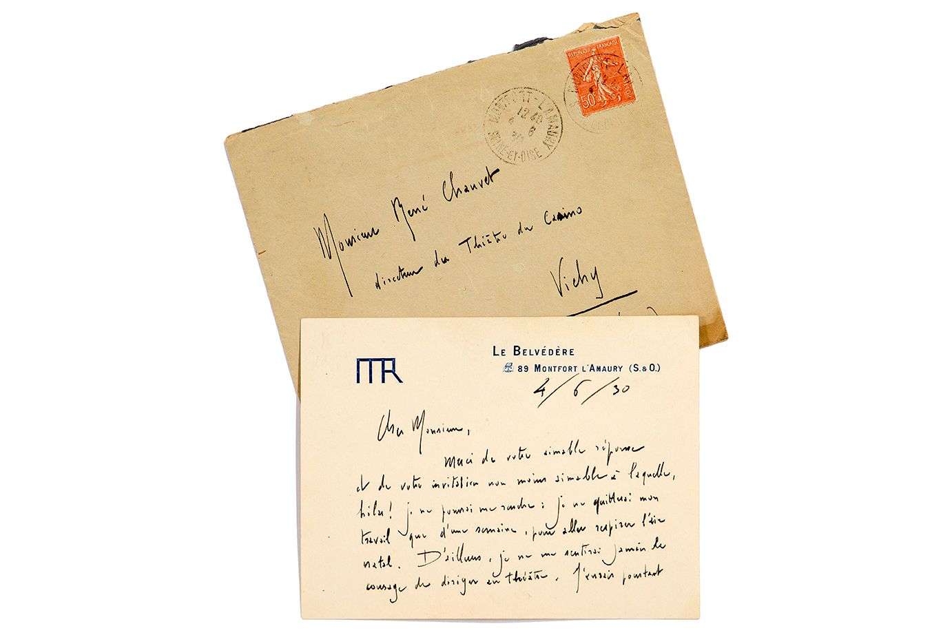 L.A.S., Le Belvédère, Montfort l'Amaury 4 juin 1930, à René CHAUVET, directeur du Théâtre du Casino de Vichy | 2 pages oblong in-12 sur carte à son monogramme, enveloppe.