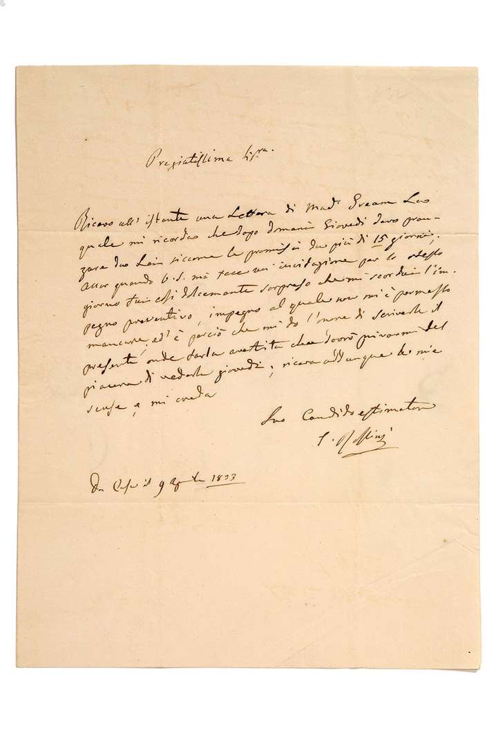 L.A.S. «G. Rossini», [Paris] 9 avril 1833, à la comtesse MERLIN | ¾ page in-4, adresse | en italien.