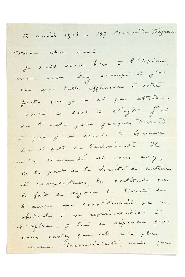 «Il m'a demandé si vous aviez, de la part de la Société des auteurs et compositeurs, la certitude que le fait de signer le livret de l'œuvre ne constituerait pas un obstacle à sa représentation. [...] Durand me demande quel titre : opéra, ou opéra-ballet, nous désirons donner à Padmâvatî.