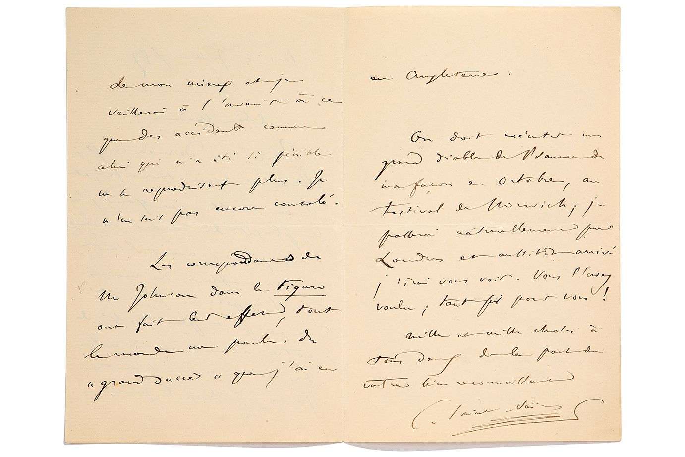L.A.S. «C. Saint-Saëns», Paris 2 juillet 1887, à une dame de Londres | 3 pages in-8.