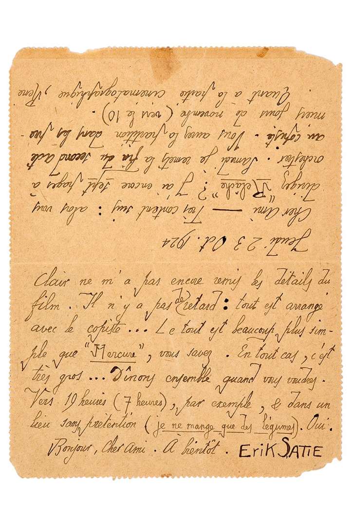 L.A.S. «Erik Satie», 23 octobre 1924, à Roger DÉSORMIÈRE | 1 page in-12, adresse au verso (carte-lettre).