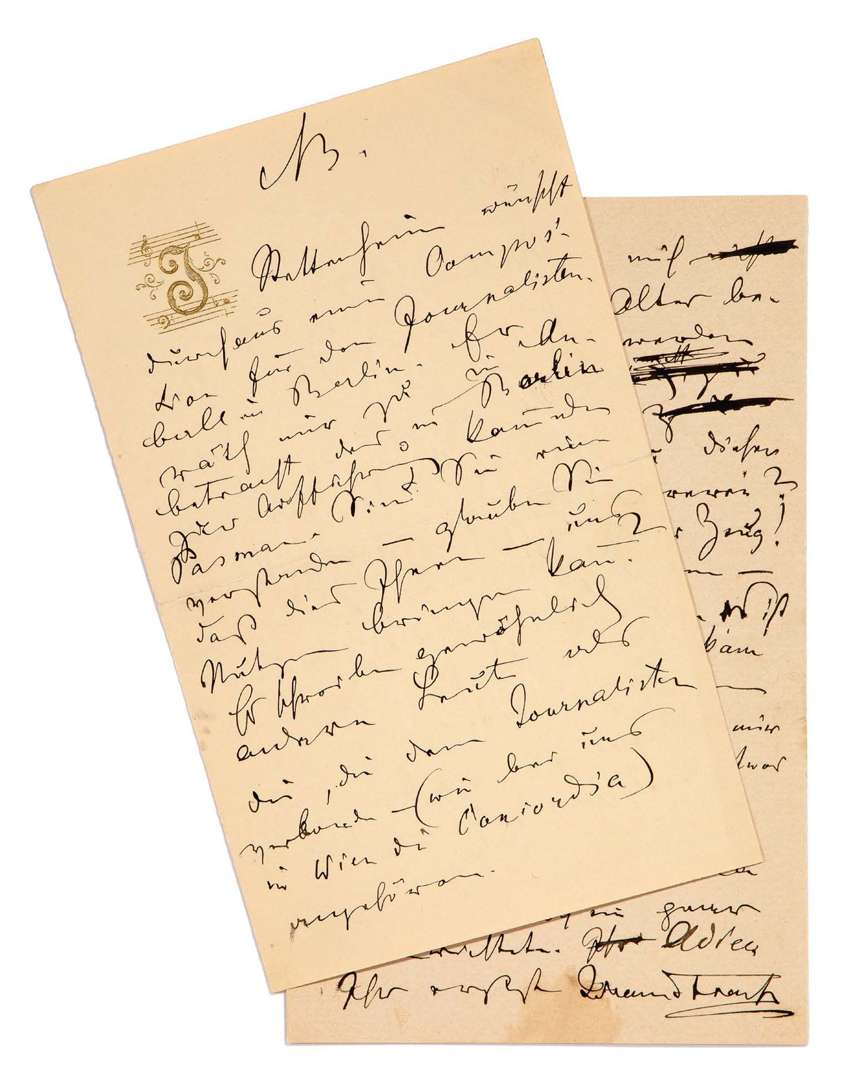 Quant à la valse Seid umschlungen Millionen [op. 443], il n'a pas encore eu le temps d'embrasser les millions | et il se livre à diverses plaisanteries sur ce titre, traitant Simrock de Crésus : «Glauben Sie es ist für Andere so leicht Millionen umschlingen zu können wie Sie mächtiger Crösus ? Sie würden mir zum Troste sorgen wollen, ist das nicht ein Glück Millionen Herzen zu umschlingen [...] Ob ich die Millionen herzen in einem Werke zu umschlingen vermöge oder nicht [...] Wo bleiben aber die Millionen die sich der Componist seit langer Zeit durch Milliarden von geschriebenen Noten zu erstreben hoff te ?». La lettre est écrite à 3 heures du matin, au sortir d'une joyeuse soirée, alors qu'il est passablement éméché...
