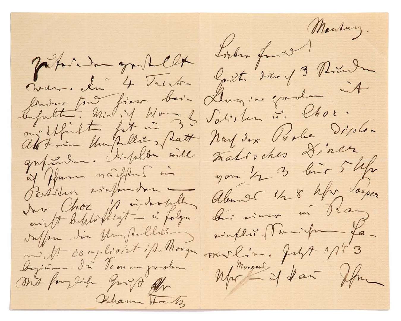 Einbußen des Zweckes eines Walzer haltend auf einem Simrock'schen Präsentirteller seiner Zeit, (da ich momentan nicht in der Lage bin, solche beabsichtigende etwas aussergewöhnliche Art des Projectes eff ectuiren zu können) ihm unterbreiten»... [Prague lundi]. 3 heures de répétition piano avec solistes et chœur, puis dîner diplomatique et souper chez une famille infl uente de Prague. Il est 3 heures du matin. Les tempi ont été exactement respectés. La basse et le ténor sont excellents, ainsi que les chœurs : les tempi s'écartent énormément de ceux des opéras de Vienne, qui sont parfois sensiblement épuisés («Die Tempi hier divergiren gewaltig mit den in den Wien Opern hin hie und da empfi ndlich vergriff enen») | il est donc content.