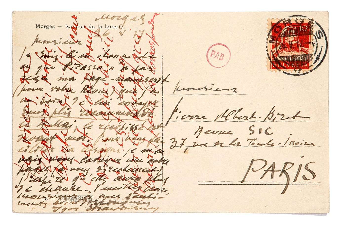L.A.S. «Igor Strawinsky»sur carte postale, Morges [26.V.1917], à Pierre ALBERT-BIROT, à la revue Sic | au verso d'une carte postale illustrée (Morges. La cour de la laiterie) avec adresse.