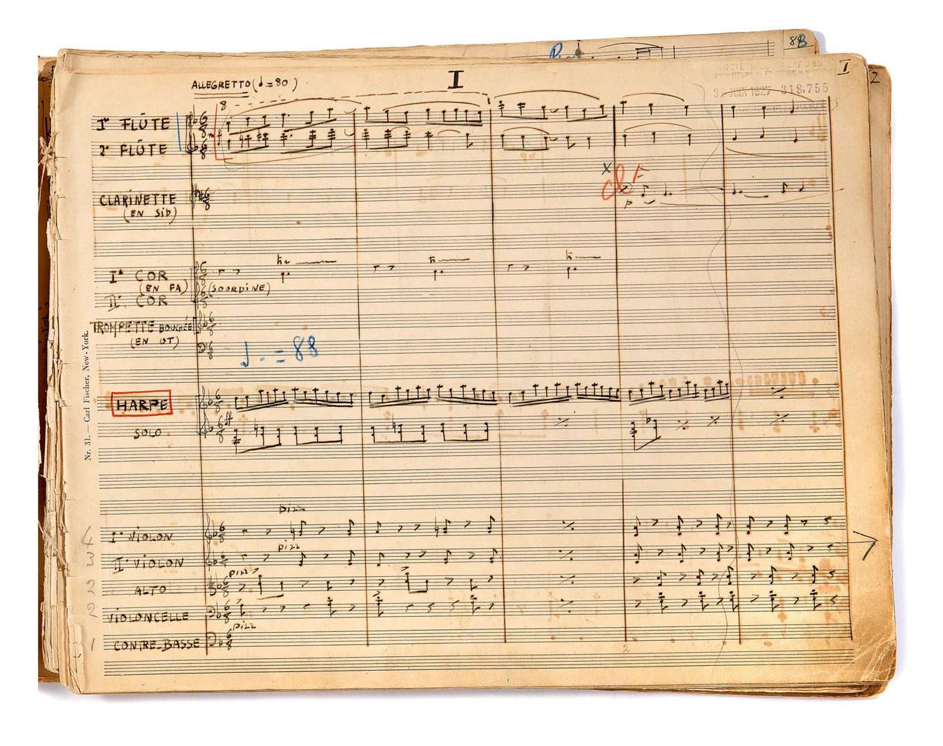 Fischer à New York | il présente de nombreuses corrections à l'encre rouge et au crayon, et des annotations | il a servi de conducteur, avec de nombreuses annotations, et porte le cachet de la Sacem en date du 30 juin 1927. Le premier feuillet donne la composition de l'orchestre: 2 flûtes (et piccolo), clarinette, 2 cors, trompette, timbales, tambour militaire, quintette à cordes, et harpe solo | au dos, la dédicace : «à Ralph Barton