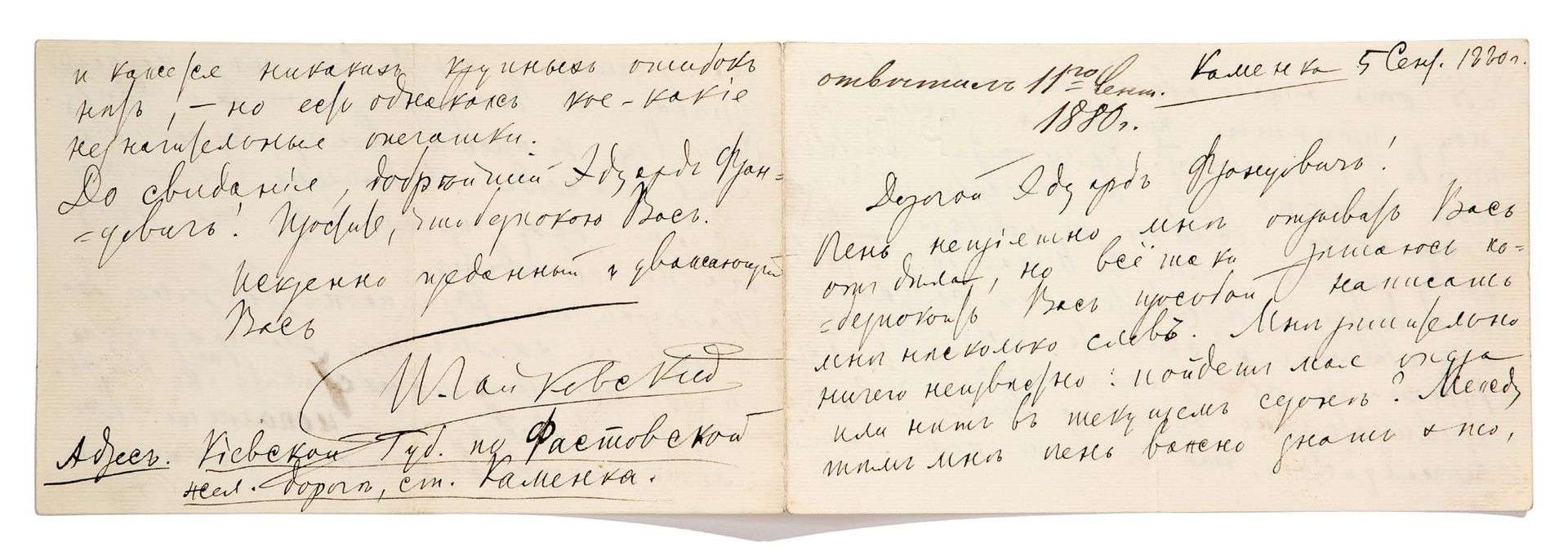 L.A.S. «P. Tchaikovski», Kamenka 5 septembre 1880, à Edouard Frantsovitch NAPRAVNIK | 4 pages oblong in-8 à son chiff re | en russe.