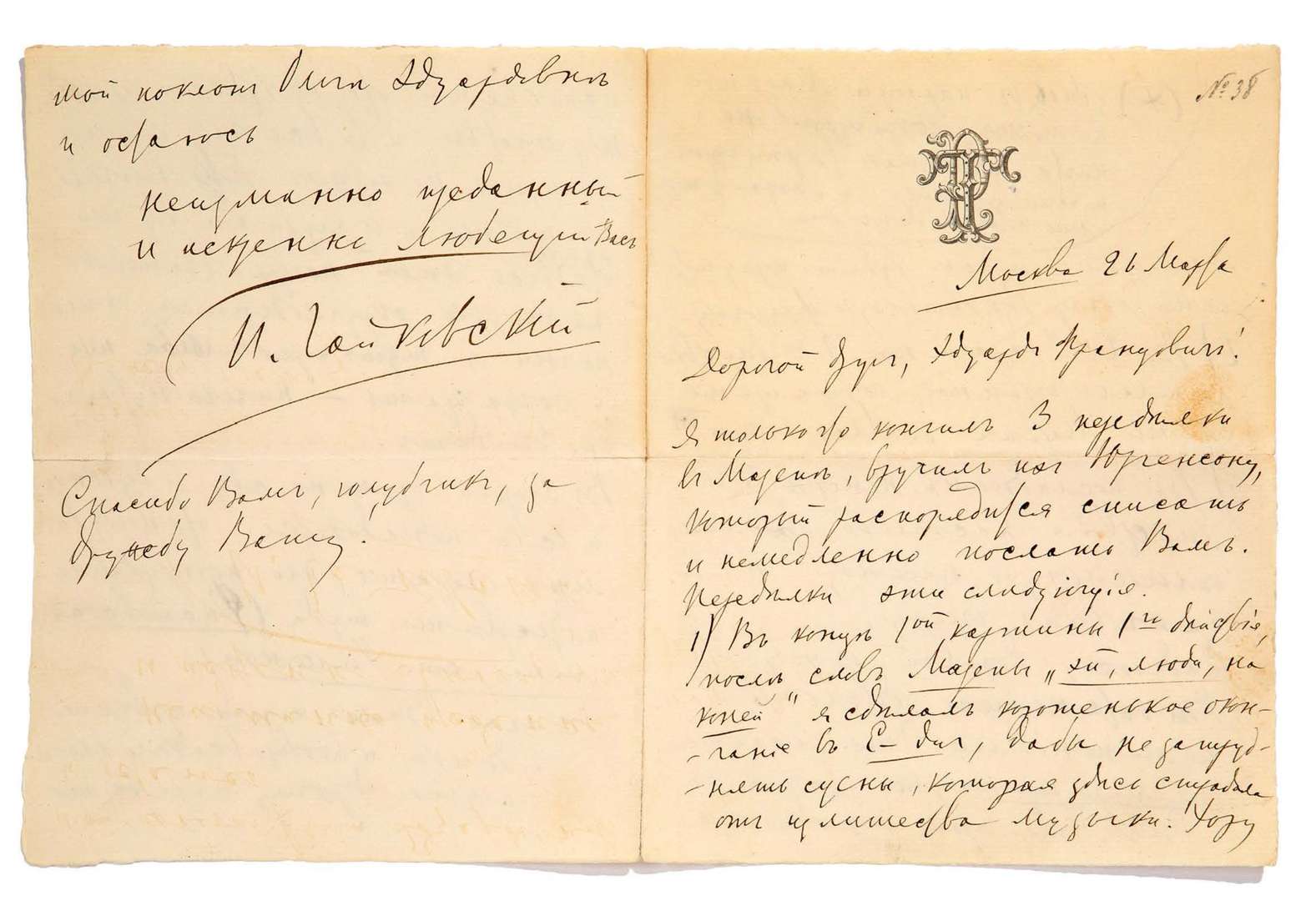 L.A.S. «P. Tchaikovski», Moscou 26 mars [1884], à Edouard NAPRAVNIK | 3 pages et demie in-8 à son chiff re (fentes) | en russse.