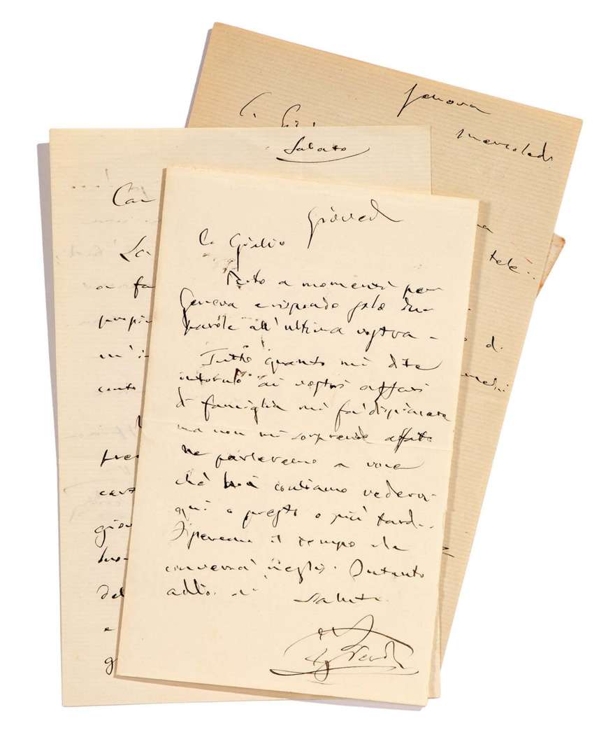 3 L.A.S. «G. Verdi», [1883-1889], à Giulio RICORDI | 1 page in-8 chaque (2 pages pour la 2e), enveloppes | en italien.