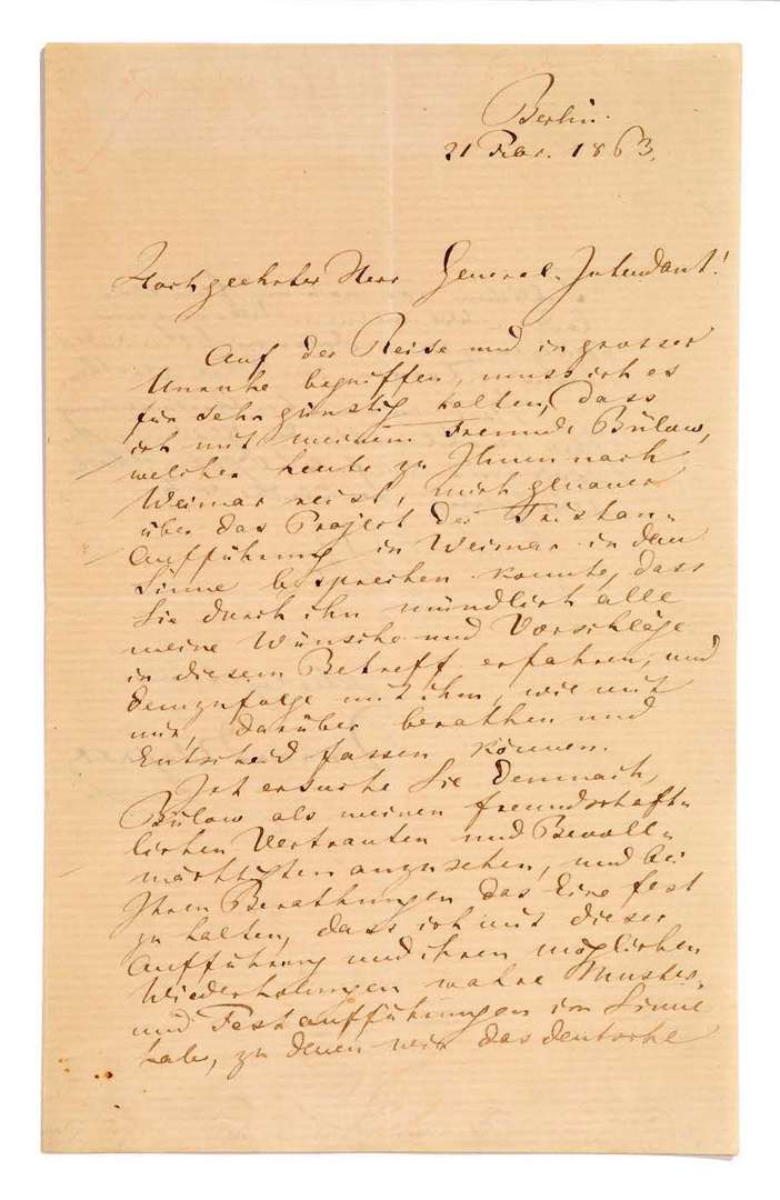 [Après avoir achevé Tristan à Venise en 1859, Wagner eut le plus grand mal à faire représenter son opéra. Diff érentes tentatives, à Paris et à Vienne notamment, se révélèrent infructueuses. Dans cette lettre, Wagner se tourne vers Weimar. Là encore, le projet échoua, et ce n'est qu'à Munich que l'opéra put être créé le 10 juin 1865, sous la baguette de Hans von Bülow et grâce au soutien fi nancier de Louis II de Bavière.]