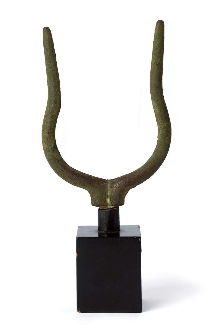 ÉLÉMENT DE COURONNE HATORIQUE en bronze, l'intérieur à gorge recevait le disque solaire emblématique. Cet élément se trouvait au dessus d'une représentation de la déesse Isis-Athor.Égypte antique, probablement Basse Époque (664 - 332 av. J.-C)