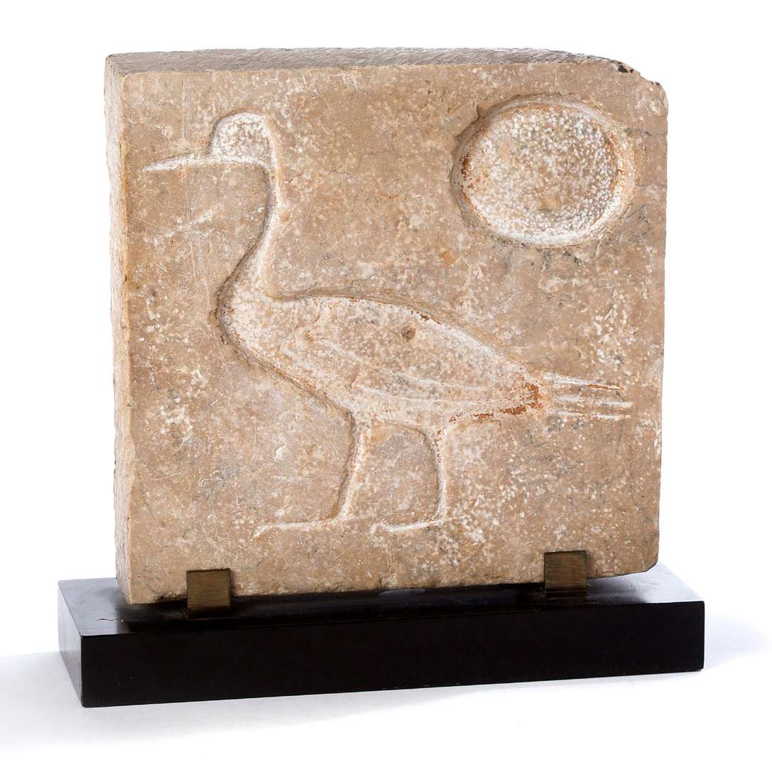 TITRE DE PHARAON « SA RÊ » fragment en pierre dure marmoréenne crème avec inclusion de veines granitiques représentant deux hiéroglyphes sculptés en creux : le hiéroglyphe du canard (Sa) et celui du dieu-soleil (Rê) signifiant littéralement «