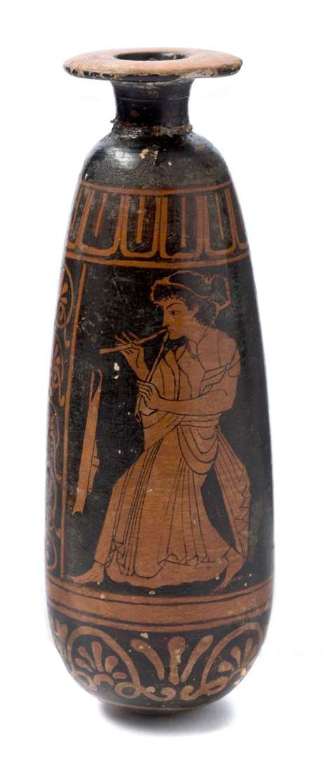 ALABASTRON à figures rouges représentant sur une face une jeune femme jouant du aulos et sur l'autre un jeune homme Terre-cuite rouge à vernis noir. Grèce Antique, Attique, 550/450 avant J.-C.