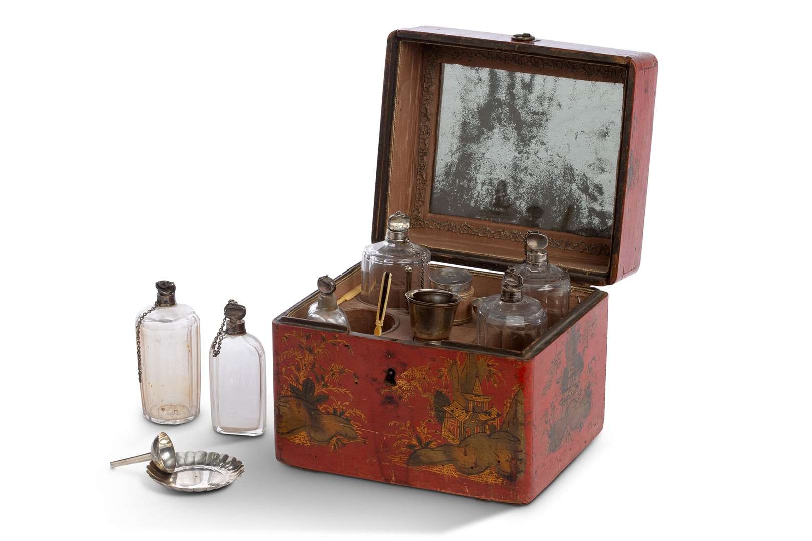 COFFRET A PARFUMS également dit à senteur en laque européenne rouge dans l'esprit du vernis Martin comprenantdeux flacons plats, quatre flacons arrondis à pans coupés, deux petits entonnoirs en argent, une petite timbale sur pied en argent, une petite coupelle polylobées, un petit couteau en argent, un petit couteau en ivoire, on y joint une petite boite ronde en argent, un cure-dents-cure-oreilles en ivoire et écaille, un petit entonnoir en métal dans un coffret en bois laqué à décor de personnages chinois dans des paysages montagneux devant des pagodes, l'intérieur garni de soie, l'abbatant supérieur dévoilant un miroir d'origine.France, XVIIIe siècle. Poinçons divers dits « aux fermiers généraux » non identifiés.