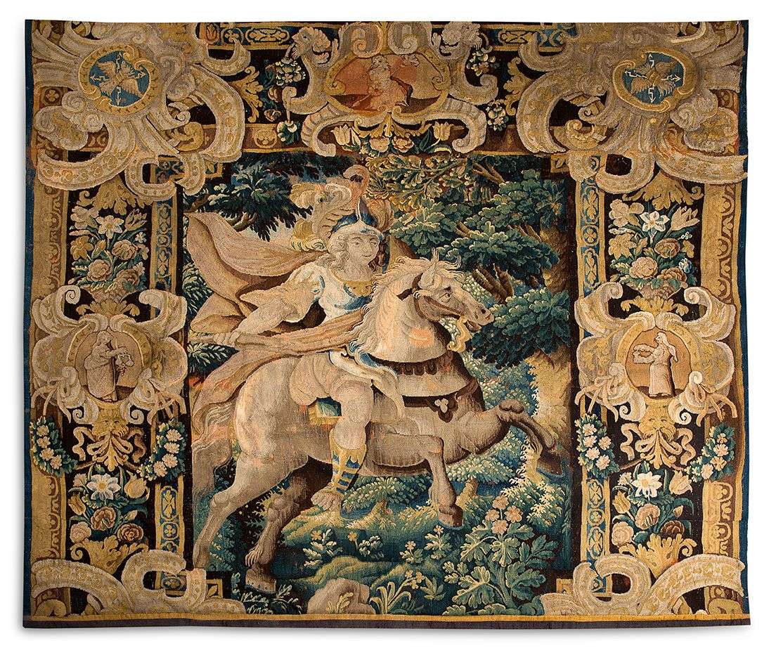 TAPISSERIE de laine et soie représentant un cavalier dans un contrefond de verdure et belle végétation. Large bordure à trois médaillons en forme de miroirs incrustés de grenadins comprenant trois des quatre vertues cardinales. Foudres de guerre dans les écoinssons supérieurs.Manufacture Royale d'Aubusson et de Felletin, vers 1630.