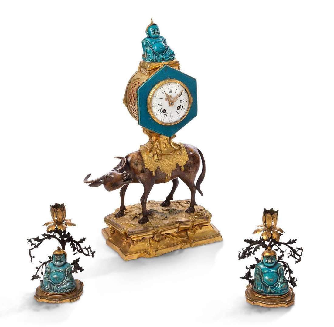 PENDULE AU BUFFLE en bronze finement ciselé doré sous la forme d'un buffle d'Asie patiné brun clair sur une terrasse finement ciselée de bronze doré le buffle supportant le mouvement inscrit dans un hexagone en biscuit émaillé turquoise elle même sommée d'un petit bouddha du type Milefo en biscuit émaillé bleu turquoise. (Chine, période Kangxi 1622 - 1722).Création composite de grande qualité de la seconde moitié du XIXe siècle.