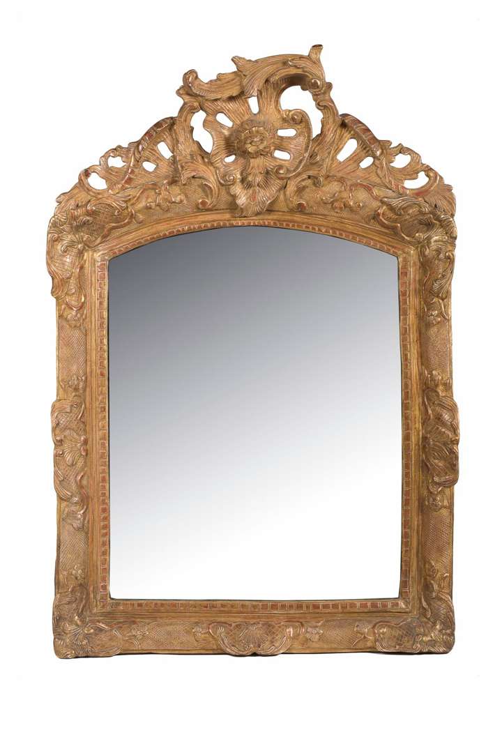 MIROIR À FRONTON en bois sculpté et doré, le cadre rectangulaire sculpté d'écoinçons à palmettes. Fronton chantourné asymétriqure à riche décor rocaille. Provence, milieu du XVIIIe siècle.