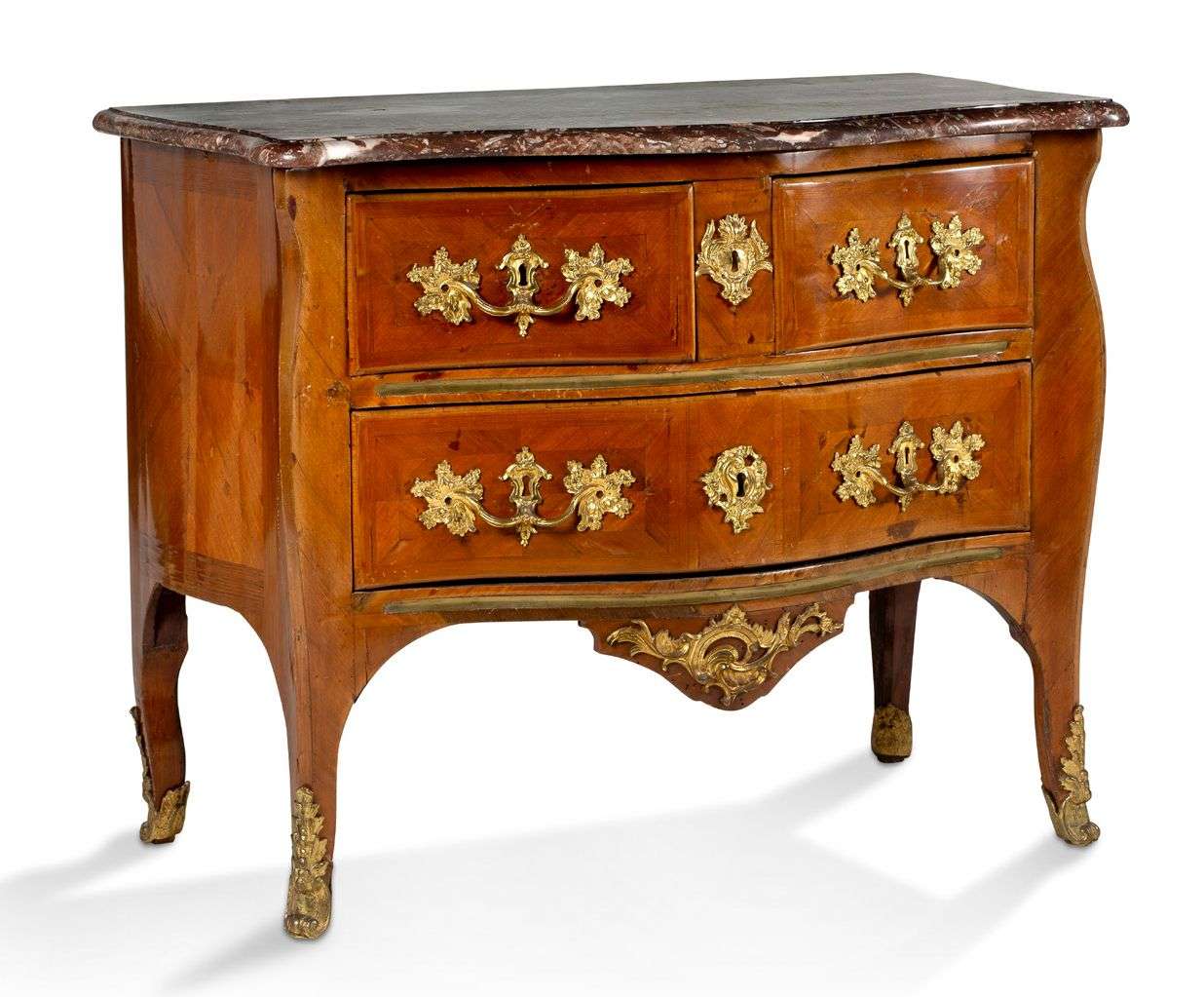 COMMODE SAUTEUSE en placage de bois de rose de forme galbée, ouvrant à trois tiroirs en façade sur deux rangs.Belle ornementation de bronzes dorés. Dessus de marbre brèche. Époque Louis XV