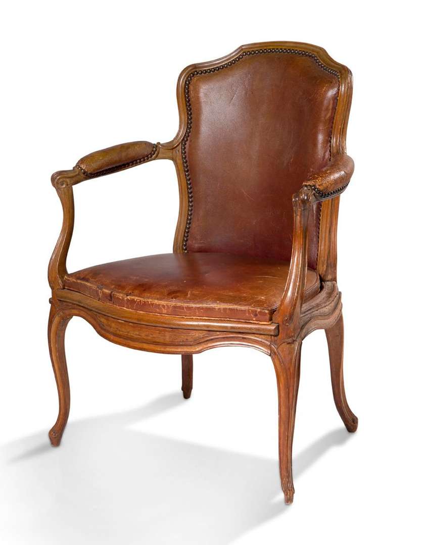 FAUTEUIL DE BUREAU en hêtre patiné à dossier plein de forme chantournée duquel se dégagent deux accotoirs à manchette terminés en volutes et maintenus par des supports en « coup de fouet ». La large assise est cannée est recouverte d'une galette de cuir (rapportée) et repose sur une ceinture moulurée et chantournée prolongée par un piétement galbé terminé en volutes. L'ornementation est aussi élégante que discrète. Estampille de Louis Cresson (reçu maître en 1738). Époque Louis XV. Garniture de cuir havane (abîmée)