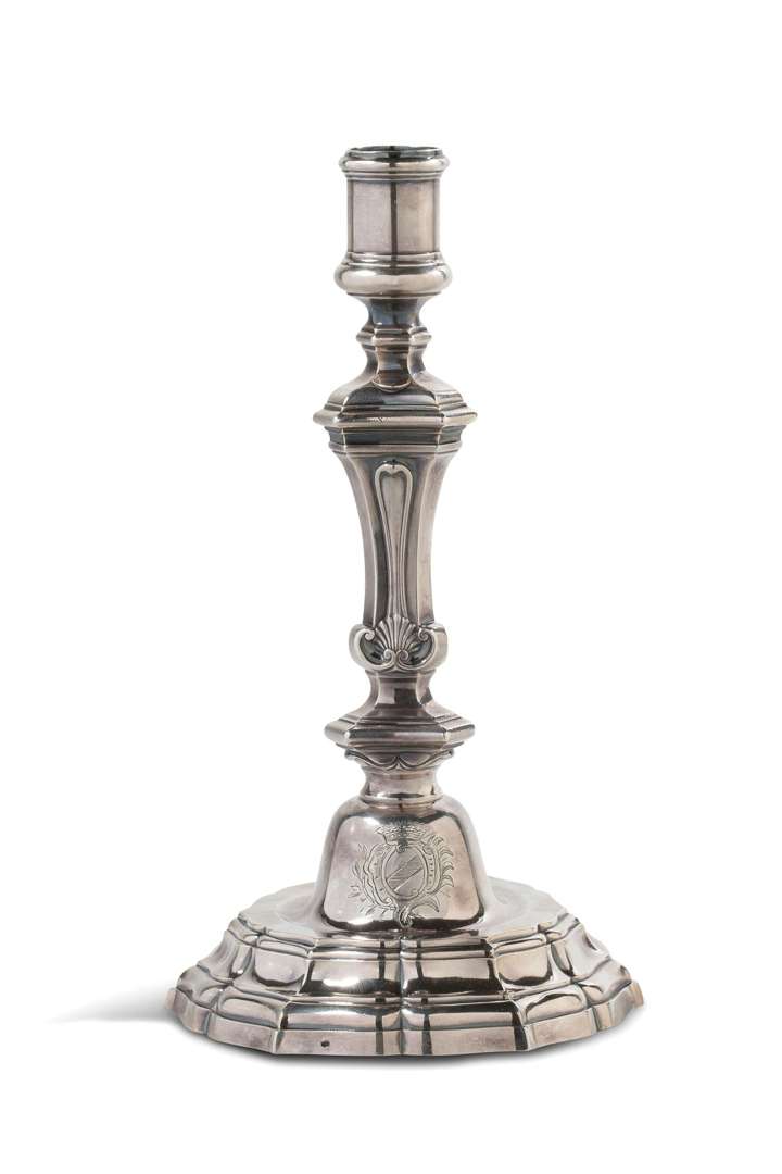 FLAMBEAU en argent, le fut balustre à décor de coquille. Pied gravé aux armoiries "d'argent, à la barre d'azur" sous une couronne comtale dans un cartouche feuillagé. Poinçons divers illisibles, France, XVIIIe siècle.
