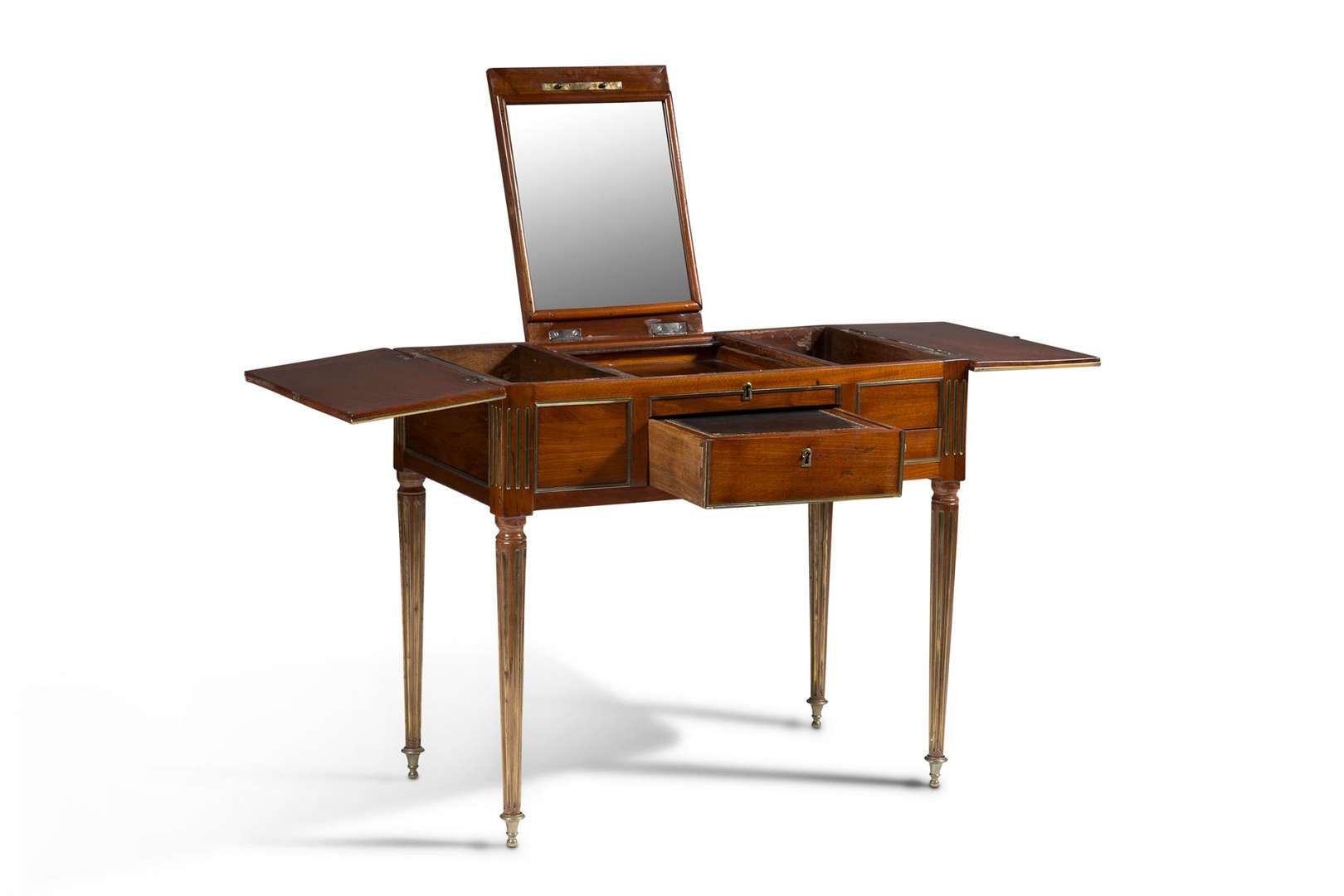 PETITE COIFFEUSE en acajou et placage d'acajou ouvrant par trois abattants supérieurs et un tiroir formant écritoire et un autre petit tiroirs en façade. Panneaux encadrés de filets de laiton. Repose sur quatre pieds fuselés, élégantes cannelures de laiton incurvé. Estampille de Joseph Schmitz (reçu maître à Paris le 18 juin 1761) Époque Louis XVI.