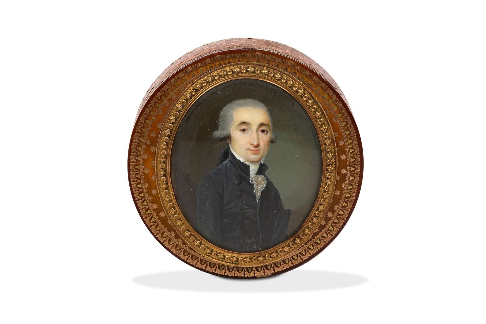 BONBONNIÈRE en écaille blonde piquée d'or vert et rose, le couvercle est orné d'une belle miniature portrait d'un homme en redingote noire signée et datée à gauche du monogramme PM et 1787 pour Pierre Musson (1739-1820). France, fin du XVIIIe siècle.