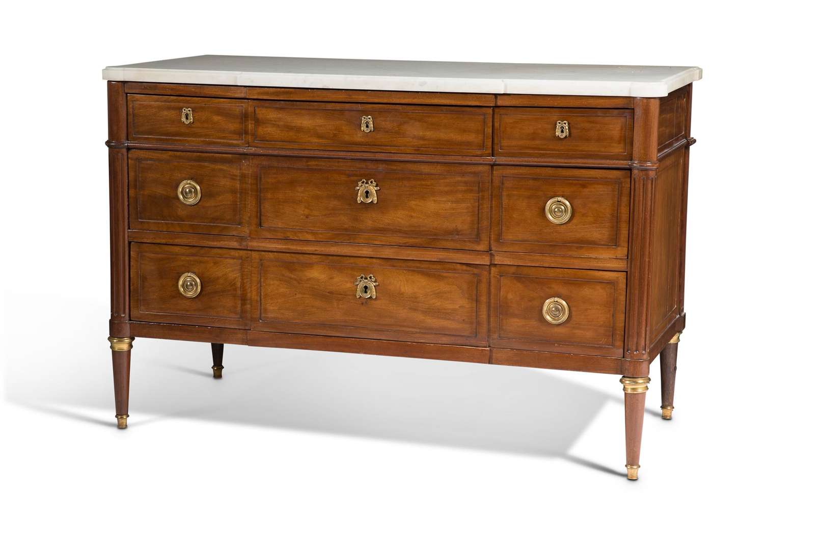 COMMODE rectangulaire en acajou ouvrant à cinq tiroirs sur trois rangs. Les montants arrondis, cannelés se terminant en fuseau, pieds cerclés de bagues de bronze. Baguette moulurée en ceinture. Dessus de marbre blanc de carrare. Époque Louis XVI.