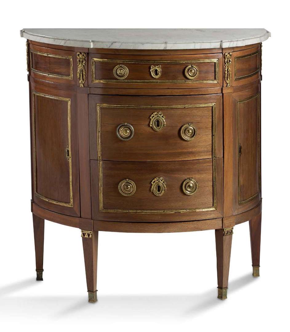 COMMODE DEMI-LUNE en placage d'acajou avec encadrements de bronze doré. Elle ouvre à trois tiroirs en ceinture et deux vantaux latéraux, elle présente des montants simple à petites chutes de bronzes dorés et repose sur des pieds en gaine à section carrée. Dessus de marbre veiné blanc.Estampille de Conrad Mauter.Époque Louis XVI Hauteur : 84 cm - Largeur : 77 cmProfondeur : 38 cm(Légèrement insolée, petits accidents et manques)