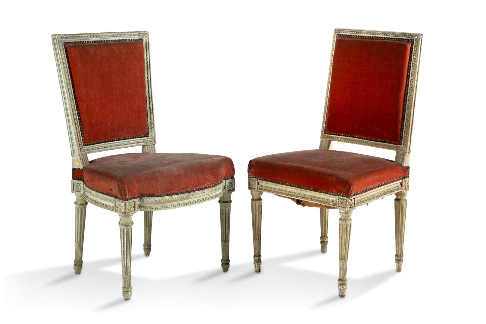 DEUX CHAISES en bois sculpté et laqué gris, les pieds fuselés à cannelures rudentées. L'une à dossier en trapèze estampillé de Georges Jacob (reçu maître le 4 septembre 1765) et portant une etiquette manuscrite à l'encre illisible sous la ceinture.Époque Louis XVI Hauteur : 87 et 89 cm - Largeur : 46 et 53 cmProfondeur : 43 et 46 cm(Très bon état général, renforts)