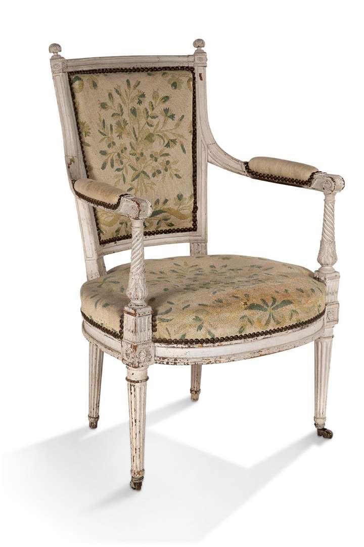 FAUTEUIL CABRIOLET en hêtre mouluré, sculpté et laqué gris, supports d'accotoirs à cannelures torses, dés de raccordements à rosaces, pieds antérieurs cannelés terminés par des roulettes de bois. Garniture de tapisserie au point à motifs floraux sur fond beige.Estampille de Jean-Baptiste-Bernard Demay (reçu maître en 1784)Époque Louis XVI Hauteur : 90 cm - Largeur : 57,5 cmProfondeur : 51 cm(Usures, trous de vers, restaurations)