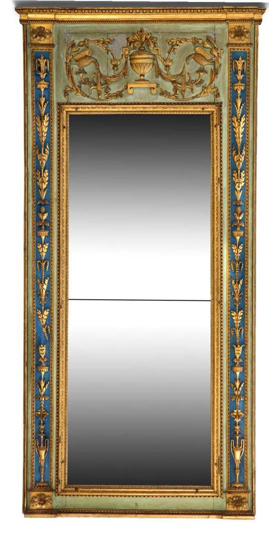 GRAND TRUMEAU rectangulaire est en bois sculpté, mouluré, doré et rechampis vert. Le fronton à décor en bas relief d'une cassolette à l'antique d'où s'échappent des rinceaux sur lesquels reposent deux oiseaux affrontés. Les montants sont sculptés d'une alternance de vases et de gerbes de blé avec rangs de perles dorés se détachant d'un fond bleu de roi.Italie, fin du XVIIIe siècle.