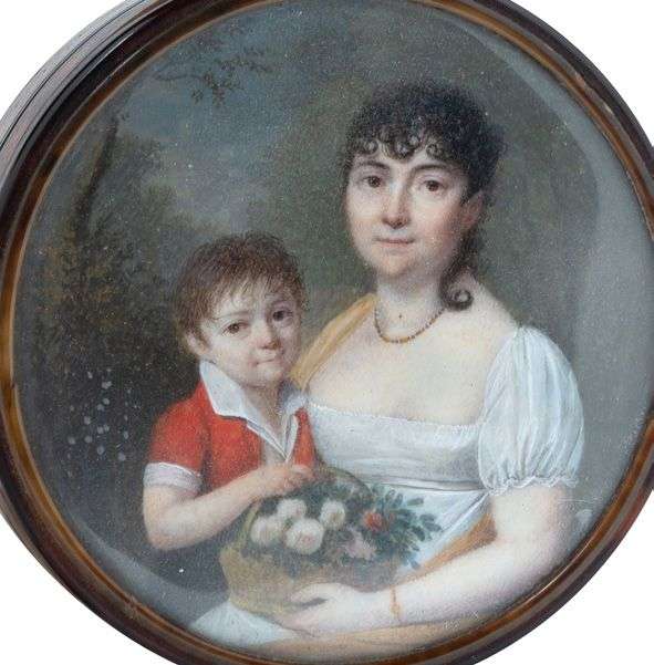 BOÎTE A MINIATURE Portrait de femme en robe blanche avec son fils, assise