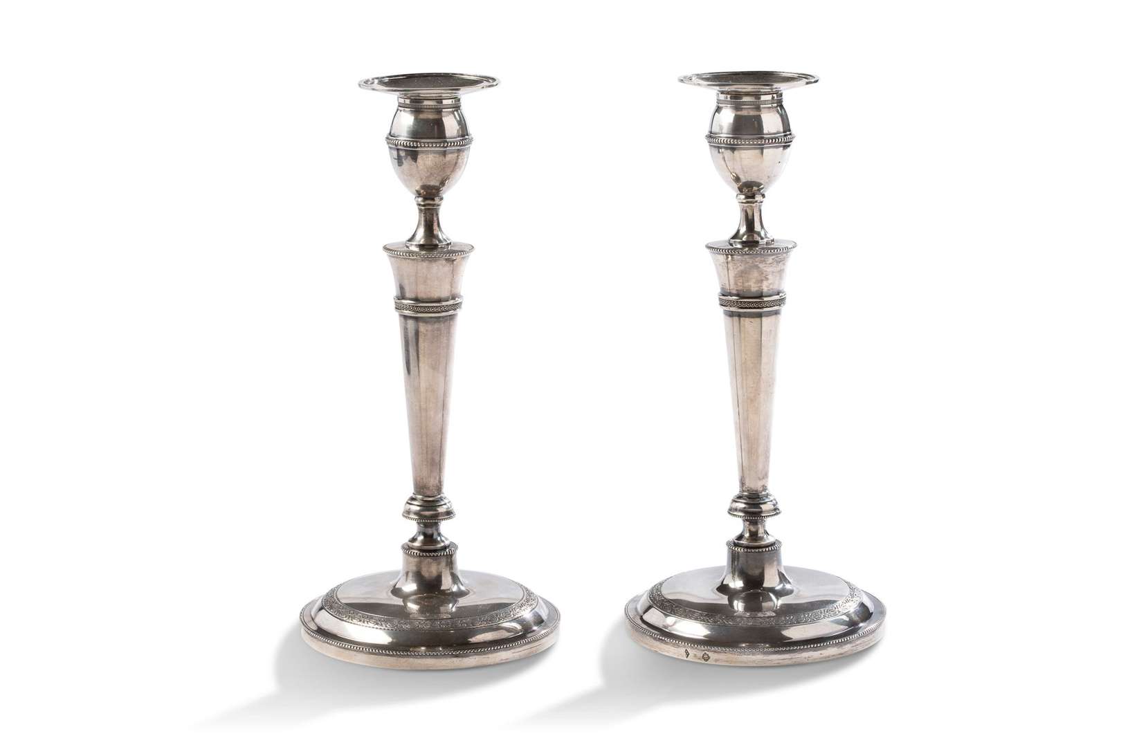 PAIRE DE FLAMBEAUX en argent, le fût fuselé à décor de firses de perles et de rinceaux, binets ovoïdes. Avec bobèches. Royaume de Sardaigne, poinçon de Giussepe Vernoni essayeur 1822. Maître orfèvre A.S non identifié.