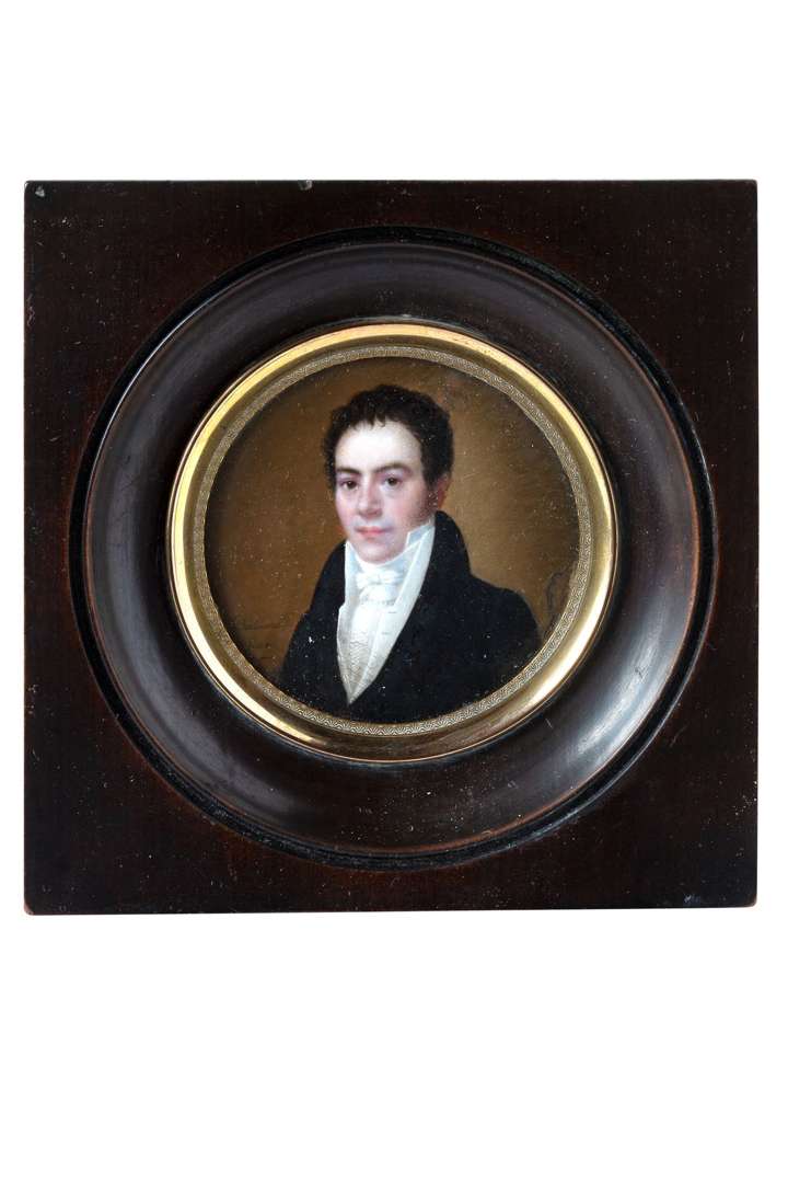 Portrait de Jean Antoine Jean-Baptiste d'Aigueperse (1787-1861), avocat, membre de l'Académie des Belles-Lettres de la ville de Lyon. Miniature, signée en bas à gauche.