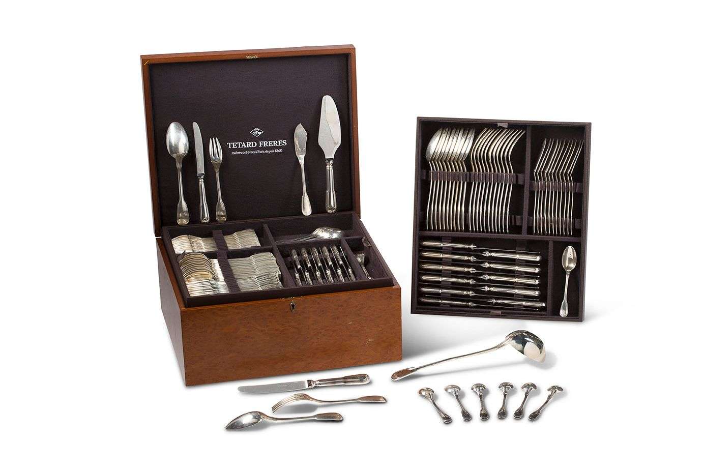 Ménagère en argent 925 millies, modèle filet contour comprenant :12 couverts (fourchettes et cuillères)| 12 couteaux, lame inox | 12 couverts à poisson| 12 couverts à entremets | 12 couteaux à fruits, lame inox | 12 cuillères à café | une louche et une pelle à tarte, lampe inox.Poinçon Minerve Ier titre.Poinçon maître orfèvre Tétard FresDans le coffret d'origine