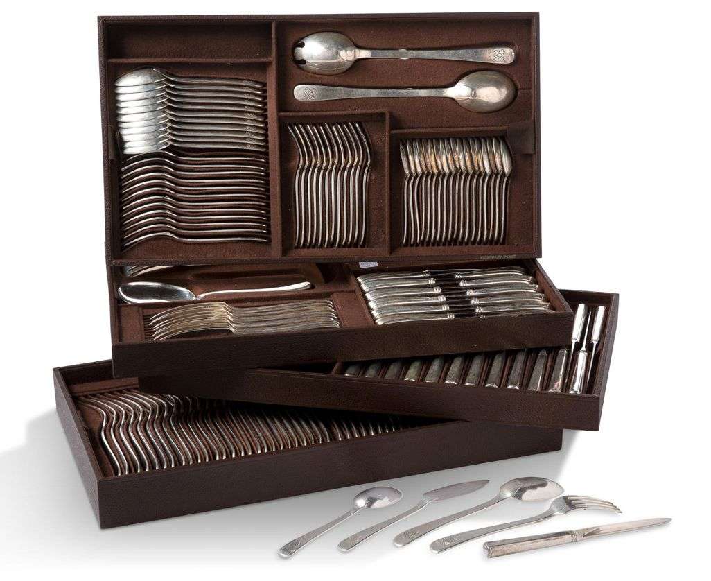 Partie de ménagère en argent, modèle uniplat, toutes les pièces gravées au chiffre LL à la manière du XVIIIe siècle. Se décompose en : 12 couteaux à fruit, 12 couteaux à fromages, 12 couteaux à poissons, 24 couteaux de table, 15 cuillères de table, 15 fourchettes, 12 fourchettes de table. 2 couverts de services. Un couvert à salade, 18 cuillères à café, 12 petites fourchettes, 12 cuillères et 12 fourchettes à entremets. Maître orfèvre : Puiforcat. Minerve.