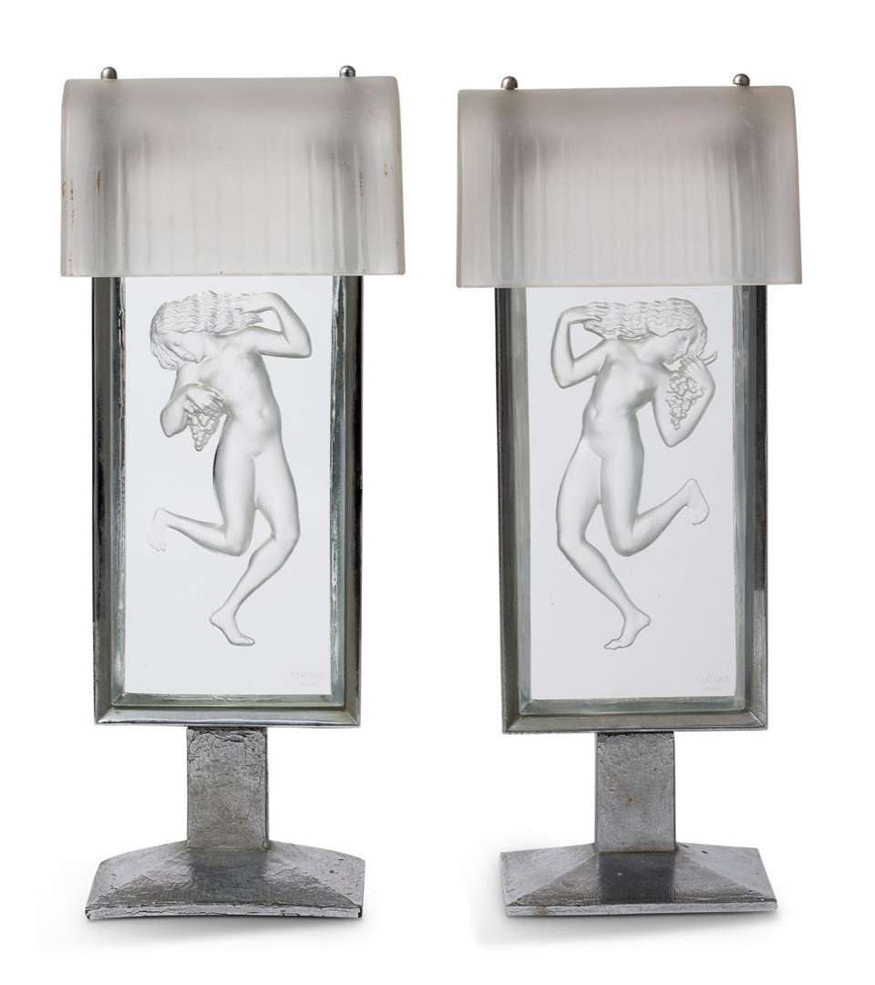 Deux lampes de cheminée « Bacchante », figurine de droite et figurine de gauche. Épreuves en verre blanc moulé-pressé, avec leurs abat-jours en verre soufflé-moulé et satiné. Monture et socle en métal nickelé. Signées R. LALIQUE FRANCE en bas à droite de chaque plaque. Modèles créés le 21 mars 1931, non continués après 1947.