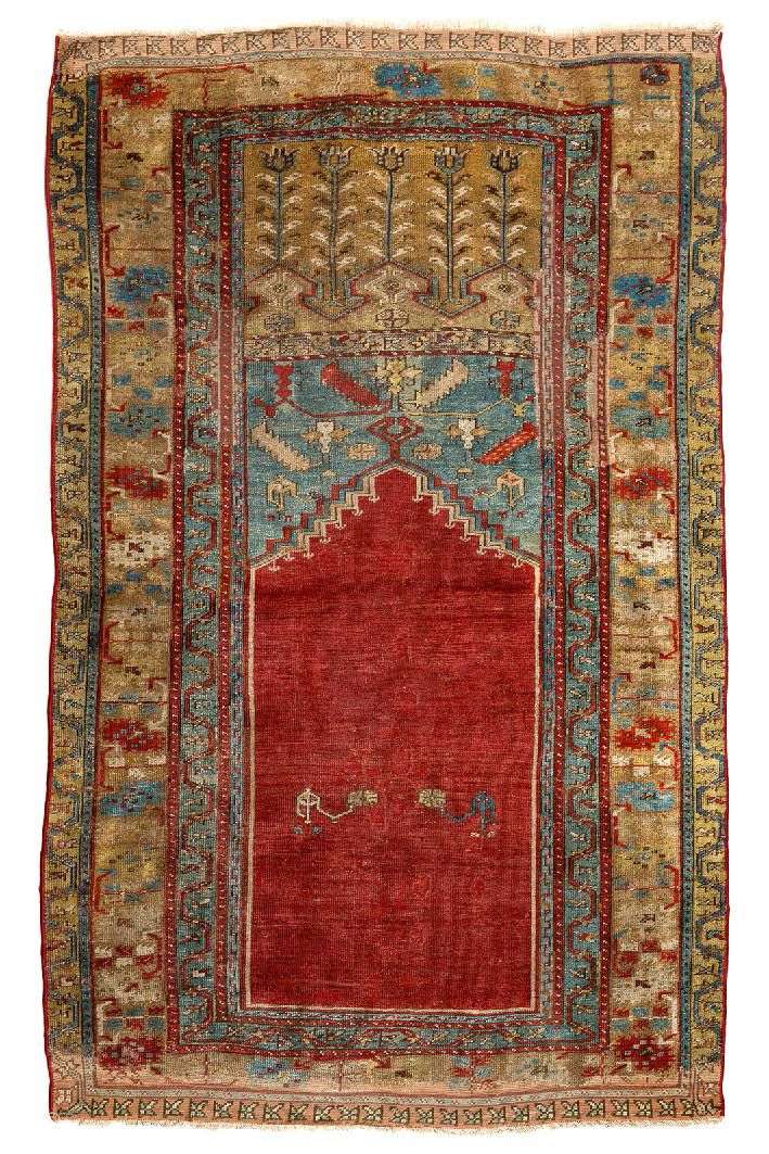 Rare tapis de forme prière Ladik (Anatolie centrale, Turquie) fin XVIIIe siècle. Velours en laine sur fondations en laine. Restaurations, oxydations naturelles, et têtes retissées. Champ rubis à mihrab crénelé, orné de double théières à boutons floraux en symétrie. Double écoinçons turquoise à feuilles de chênes dentellées en forme de chenilles et petites théières stylisées. Original bandeau vieil or à triple niches de prière ornées de cinq rangées de tulipes (typiques des Ladik). Sept bordures dont la principale safran à entrelacs de fleurs et feuillages stylisés.
