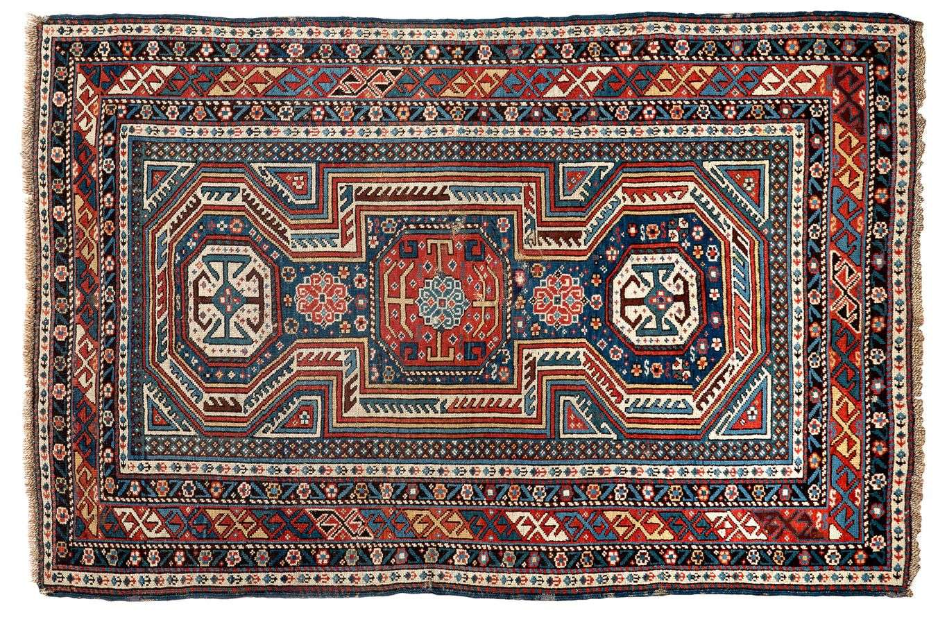 Fin Konagend (Caucase) fin XIXe siècle. Velours en laine sur fondations en laine. Restaurations. Petit trou. Légères oxydations et usures naturelles. Belle polychromie. Travail Armenien. Champ bleu nuit à original décor d'un très large médaillon central en forme de croix Arménienne formée par deux médaillons octogonaux reliés per un médaillon central en forme de carré, incrustés de peignes, crochets, tarentules, crabes, noeuds sans fins et boutons floraux en polychromie. Cinq bordures dont la principale brique à crochets et pinces de crabes multicolores stylisés géométriquement.