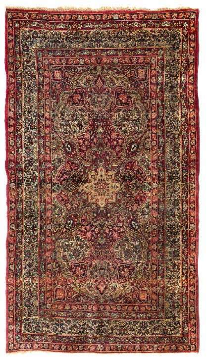 Fin Kirman Laver (Perse, village de Raver prononcé Laver) fin XIXe siècle. Velours en laine d'agneau sur fondations en coton. Densité d'environ 7 500 noeuds au dm2. Bel état de conservation. Bon état général. Tache au dos. Belle polychromie. À original décor de succession de réserves polylobées incrustées de guirlandes et rinceaux de fleurs et feuillages stylisés, orné d'un médaillon central beige à bouton de fleurs étoilées. Cinq bordures dont la principale ivoire à ramages de guirlandes de mille fleurs polychromes en forme de diamants stylisés éclatés.