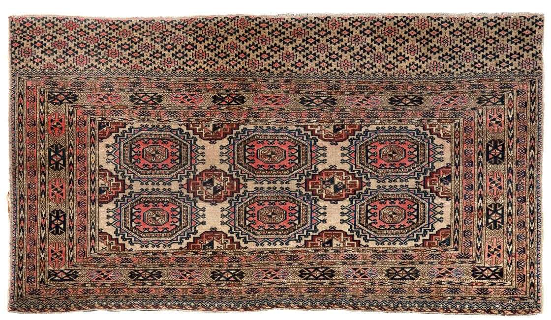 Fin tapis de selle Tchouval Tekke Boukhara (Turkmen) fin XIXe siècle. Velours en laine sur fondations en laine. Légères usures et oxydations naturelles. Champ beige (couleur rare notamment dans les tapis de selles ). À décor de deux rangées de trois guhls (pattes d'éléphants stylisées géométriquement en forme de diamants). Multiples bordures à tarentules, insectes stylisés.