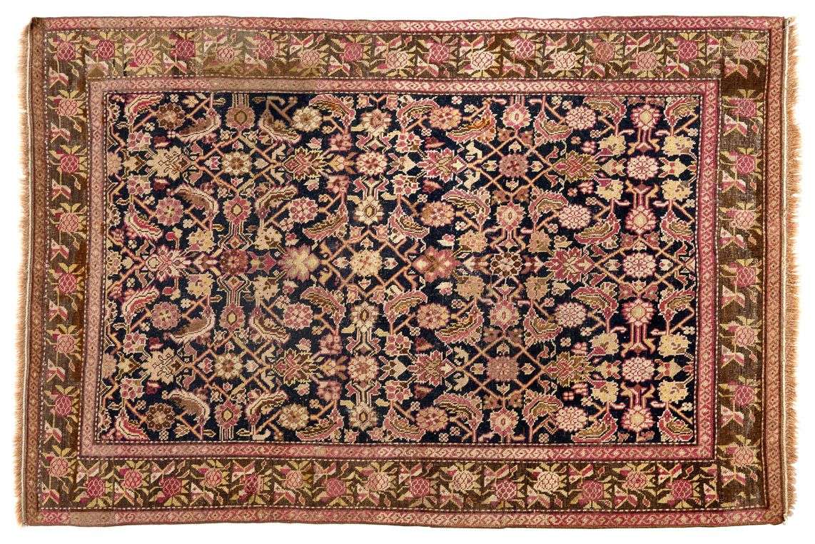 Karabagh (Arménie) fin XIXe vers 1870. Velours en laine sur fondations en laine. Restaurations. Légères oxydations naturelles. Champ bleu nuit à décor Herati : semis de palmettes de fleurs et feuillages stylisés vieux rose reliées par des tiges en forme de diamants stylisés. Triple bordures dont la principale brun à semis de bulbes floraux.