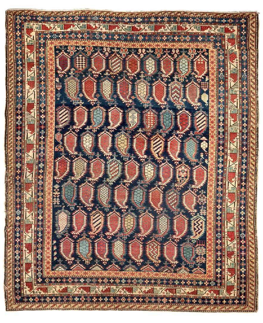 Très fin et original Marasali (Caucase) fin XIXe siècle, vers 1870/1880. Velours en laine sur fondations en laine. Petit accident en lisière. Bel état de conservation. Belle polychromie. Remarquable fraîcheur des coloris. Champ bleu nuit à semis de botehs (symbole de la genèse et de la fécondité, motif de la graine que l'on retrouve dans les châles cachemires) en forme de becs d'oiseaux stylisés géométriquement en polychromie. Cinq bordures dont la principale ivoire à décor de perroquets stylisés multicolores.