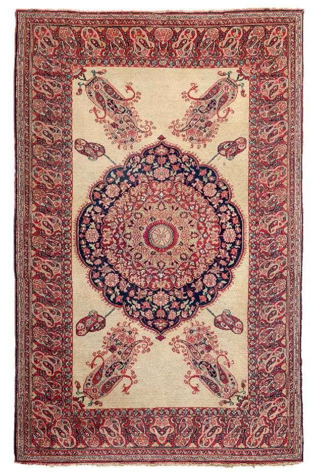 Rare, fin et original Dorochk (région de Meched et khorassan ) vers 1880. Velours en laine soyeuse de qualité sur fondations en coton. Bel état de conservation. Bon état général. Légère oxydation en lisière. Tache au dos. Champ ivoire à très large médaillon central floral polylobé bleu nuit et rubis en forme de diamant stylisé entouré de botehs (symbole de la genèse et de la fécondité, motif de la graine que l'on retrouve dans les châles cachemires) en symétrie. Quatre originaux écoinçons à coupelles de compositions de botehs finement dessinés polychromes. Six bordures dont la principale rubis à décor rappelant les écoinçons.