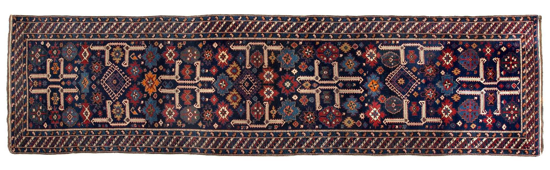 Très importante et exceptionnelle Galerie Kouba (Caucase) vers 1870/1880. Velours en laine sur fondations en laine. Belle polychromie. Très bel état de conservation. Remarquable fraîcheur des coloris. Très bon état général. Champ bleu nuit à décor de dragons stylisés géométriquement en symétrie en forme de pinces de crabes, entourés de multiples bulbes, boutons de fleurs étoilés en polychromie. Triple bordures dont la principale bayadère, à bandes et rayures en diagonales multicolores.