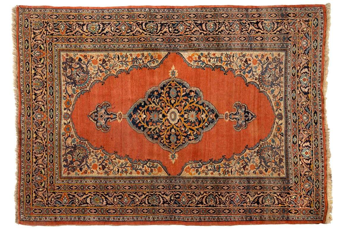 Fin Tabriz Djaffer (Iran) fin XIXe début XXe siècle. Atelier du Maitre Djaffer. Velours en laine d'agneau soyeuse de qualité sur fondations en coton. Densité d'environ 8 500 noeuds au dm2. Petits points d'oxydations. Très belle fraîcheur des coloris. Bon état général. Champ brique à décor d'un large médaillon central polylobé bleu nuit incrusté d'une composition florale étoilée cruciforme polychrome, entouré de deux fers de lance sur un contre-fond beige formant quatre écoinçons à bulbes floraux multicolores. Six bordures dont la principale bleu nuit à entrelacs de palmettes entourées de fines tiges crénelées en anneaux.